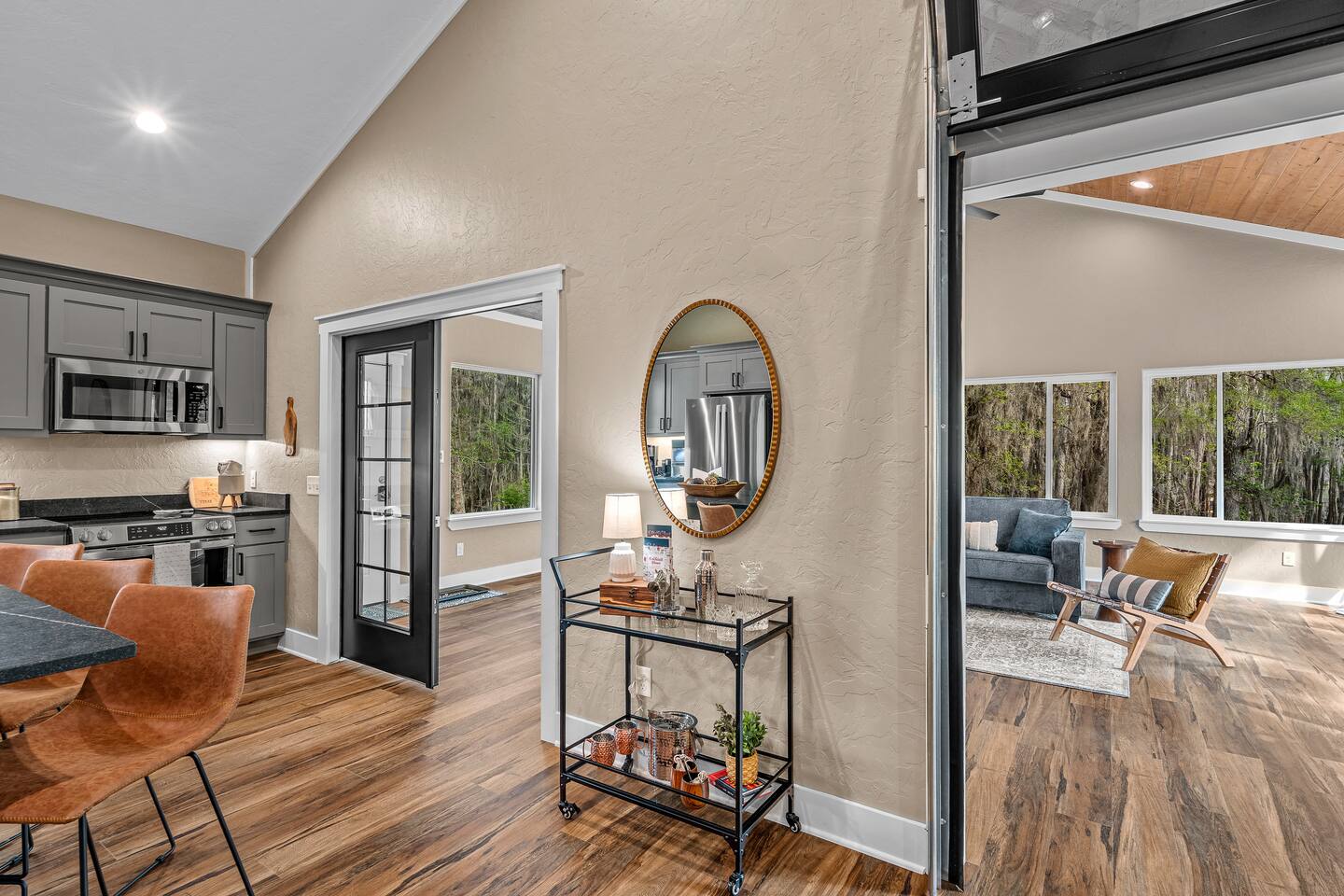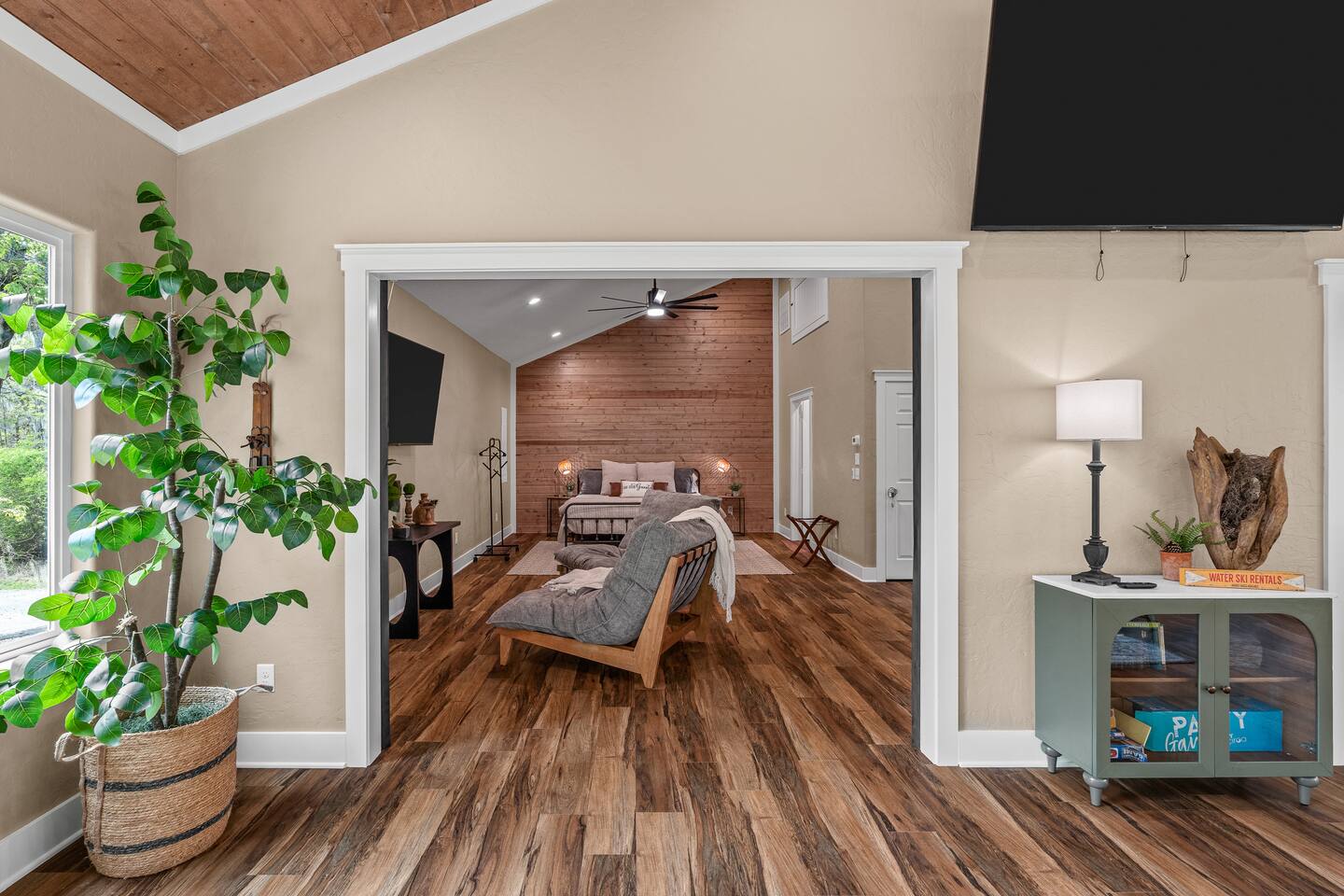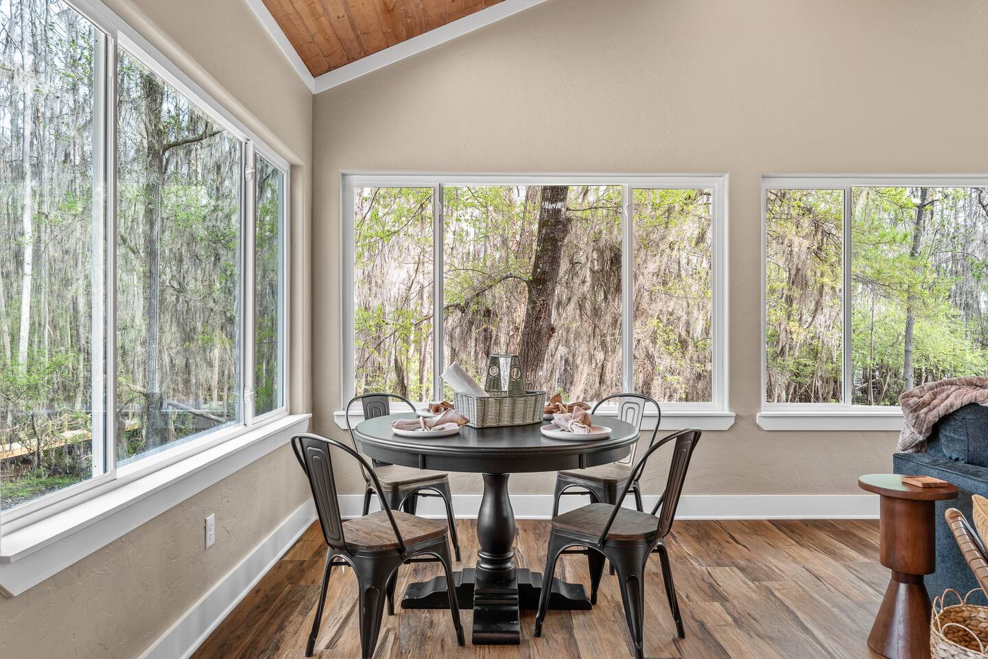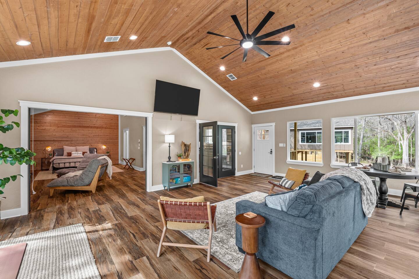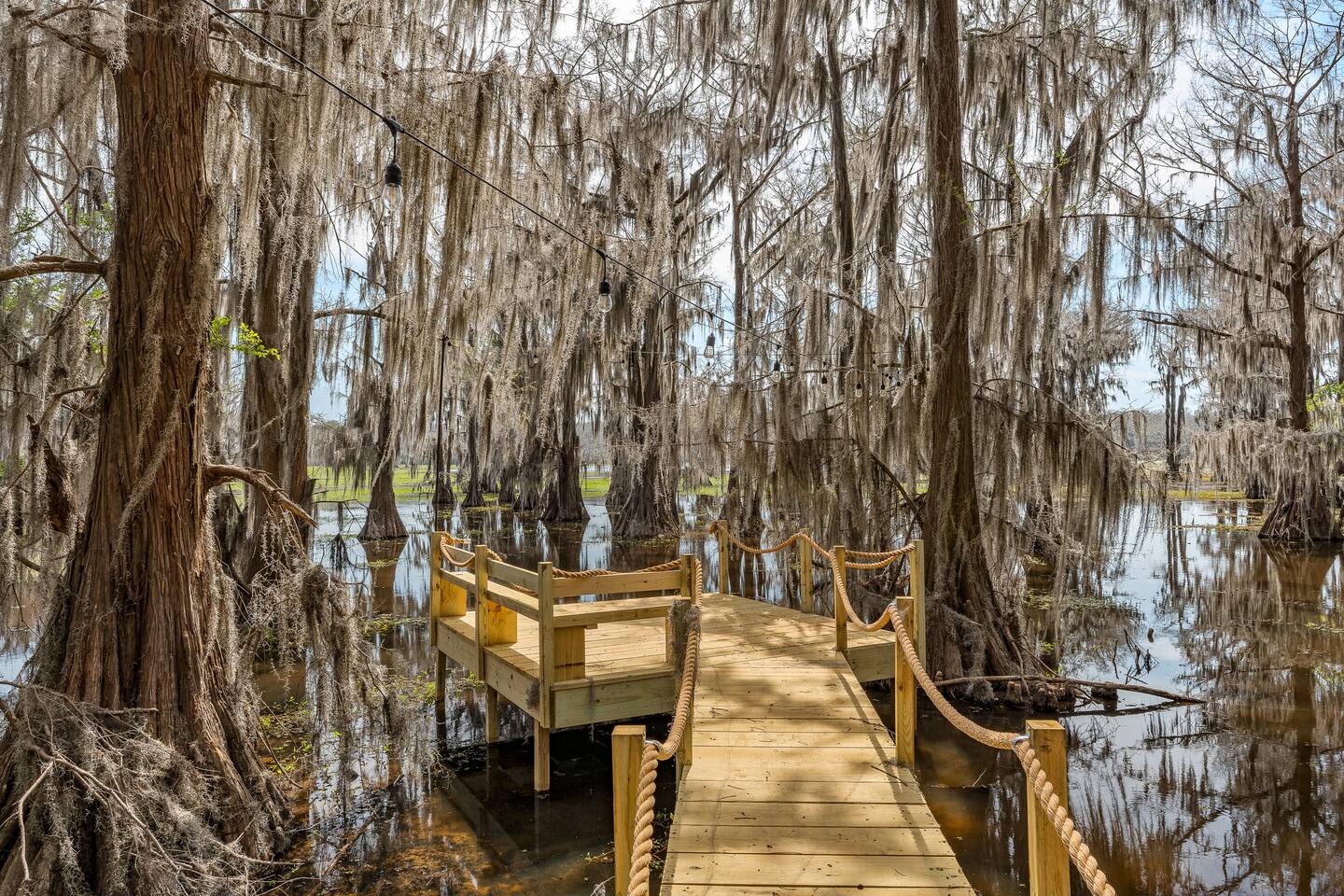 Tucked away on the cypress-lined shores of legendary Caddo, The Grove @ Jackson Arms Hideout sits elevated on piers above the water - giving you the feeling of floating among the treetops. Inside, soaring vaulted ceilings, warm wood floors, and walls of windows frame breathtaking views of Spanish moss and still water. This isn't just a getaway, it's a full reset. Kayak, fish, unwind in the soaking tub, or just watch the herons from your cozy chair while sipping your hot vanilla latte.