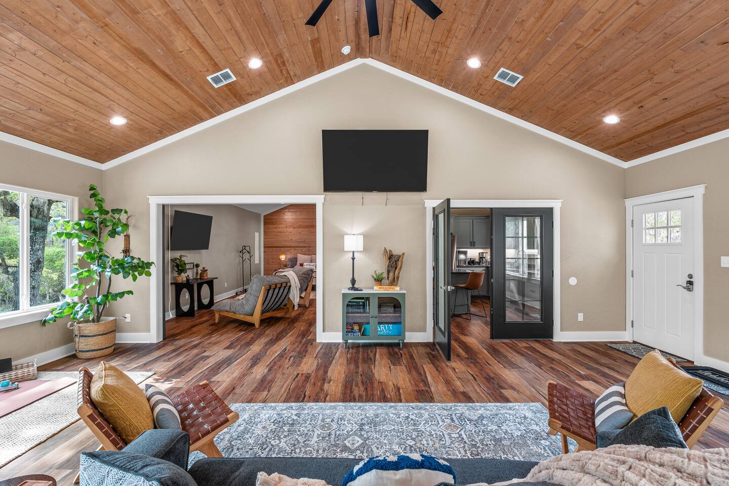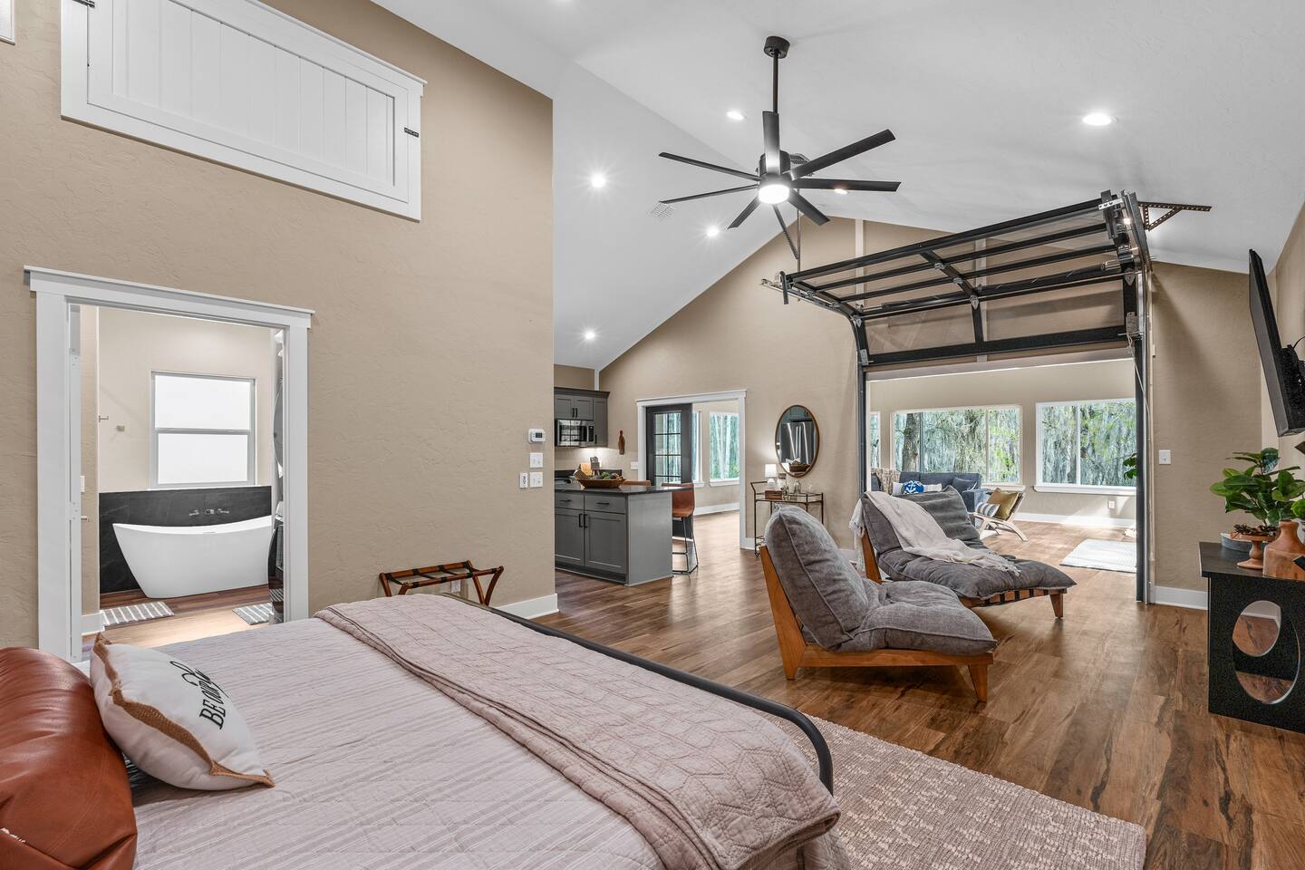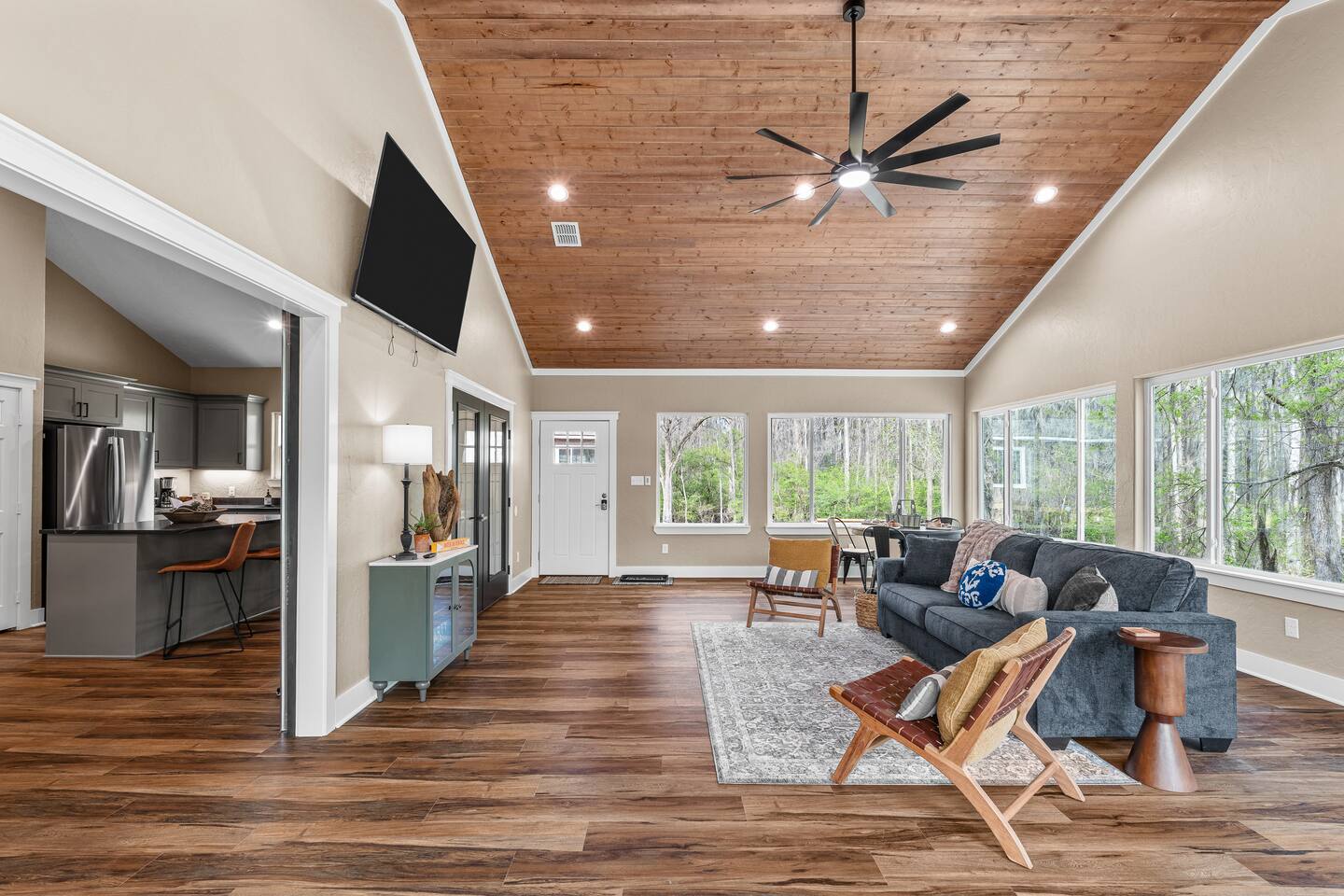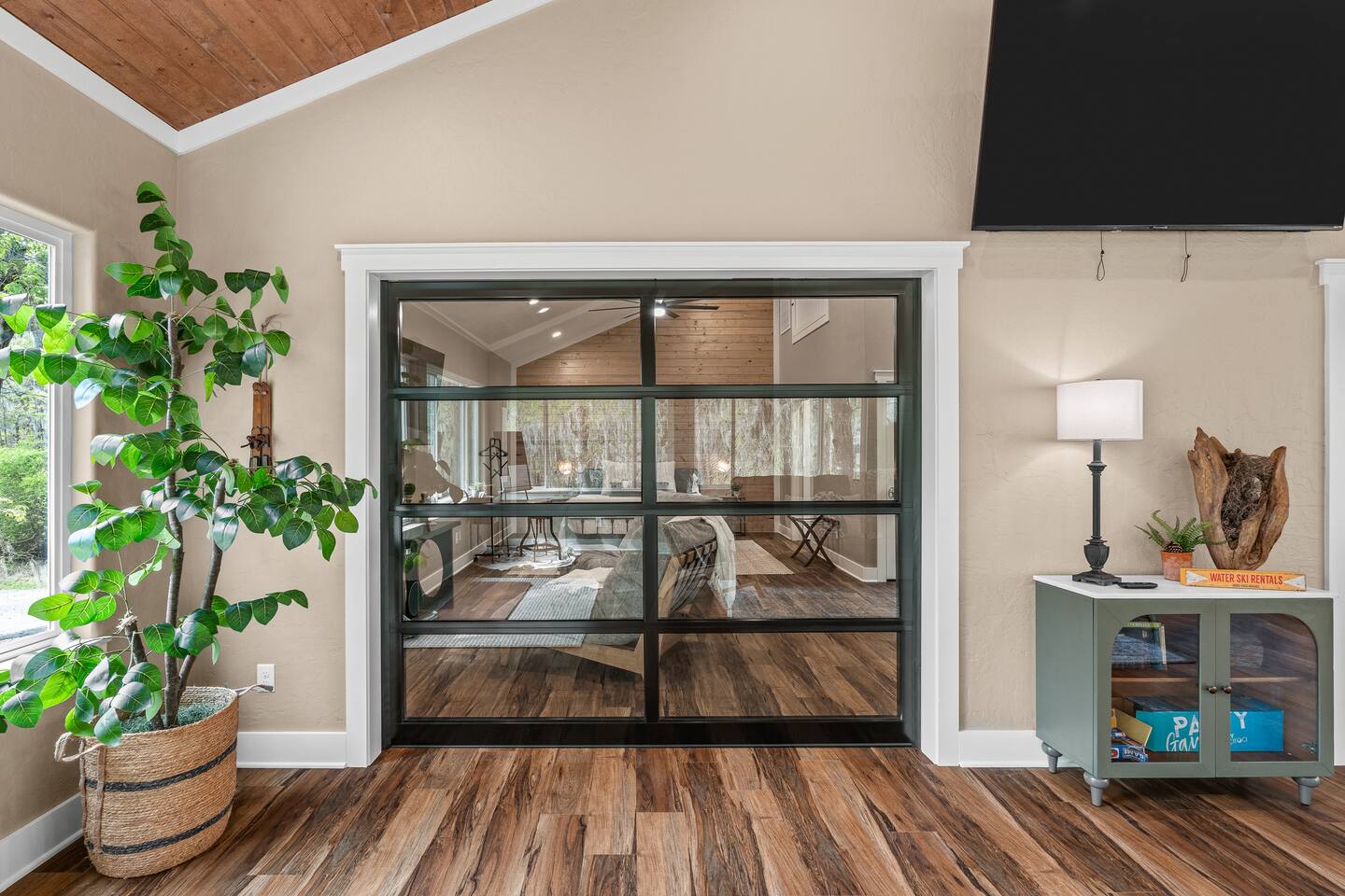 Tucked away on the cypress-lined shores of legendary Caddo, The Grove @ Jackson Arms Hideout sits elevated on piers above the water - giving you the feeling of floating among the treetops. Inside, soaring vaulted ceilings, warm wood floors, and walls of windows frame breathtaking views of Spanish moss and still water. This isn't just a getaway, it's a full reset. Kayak, fish, unwind in the soaking tub, or just watch the herons from your cozy chair while sipping your hot vanilla latte.