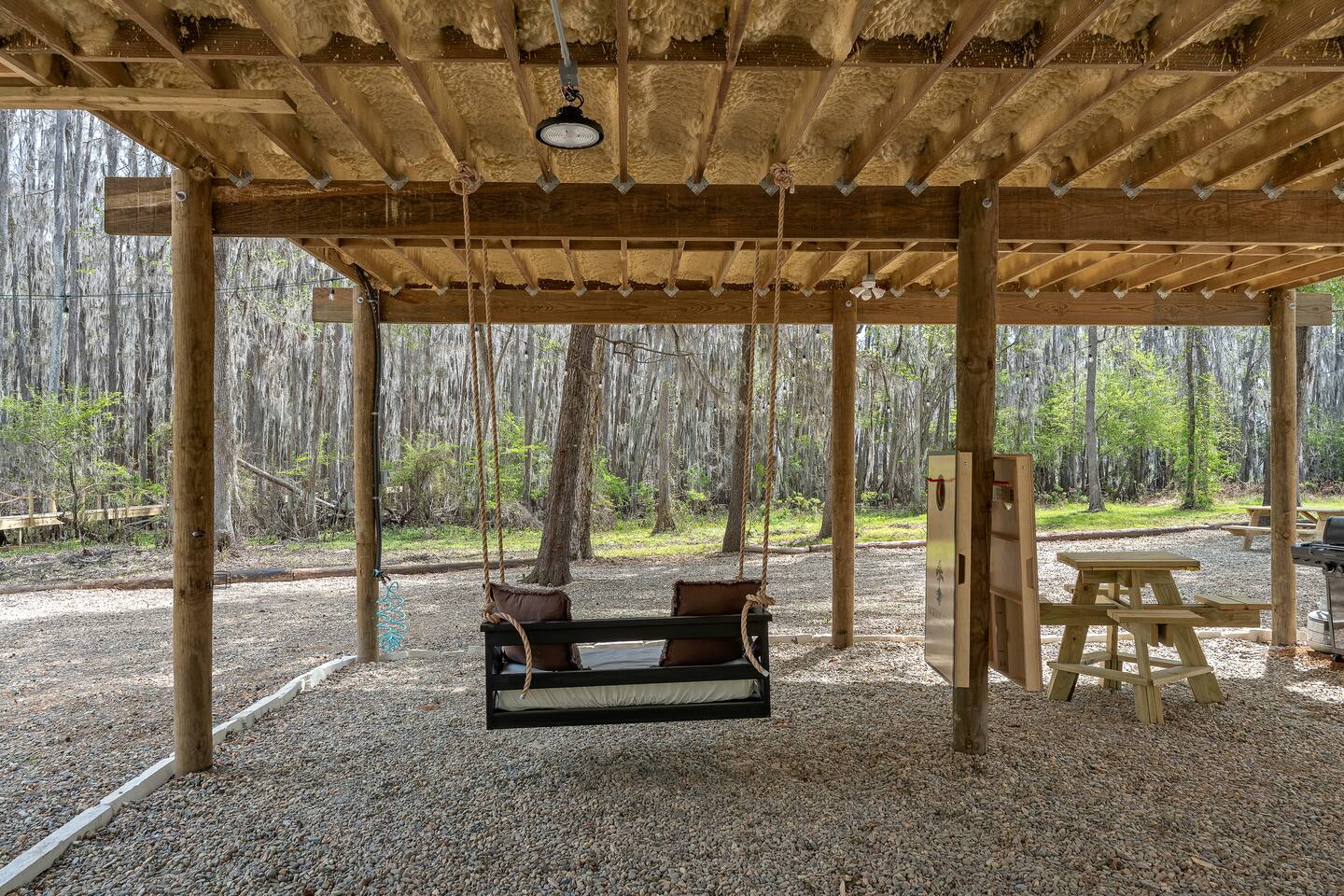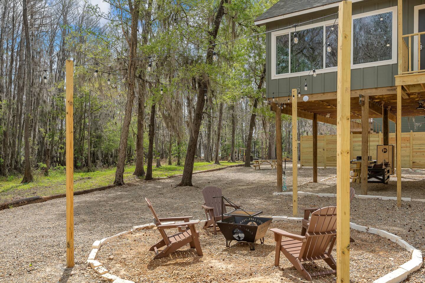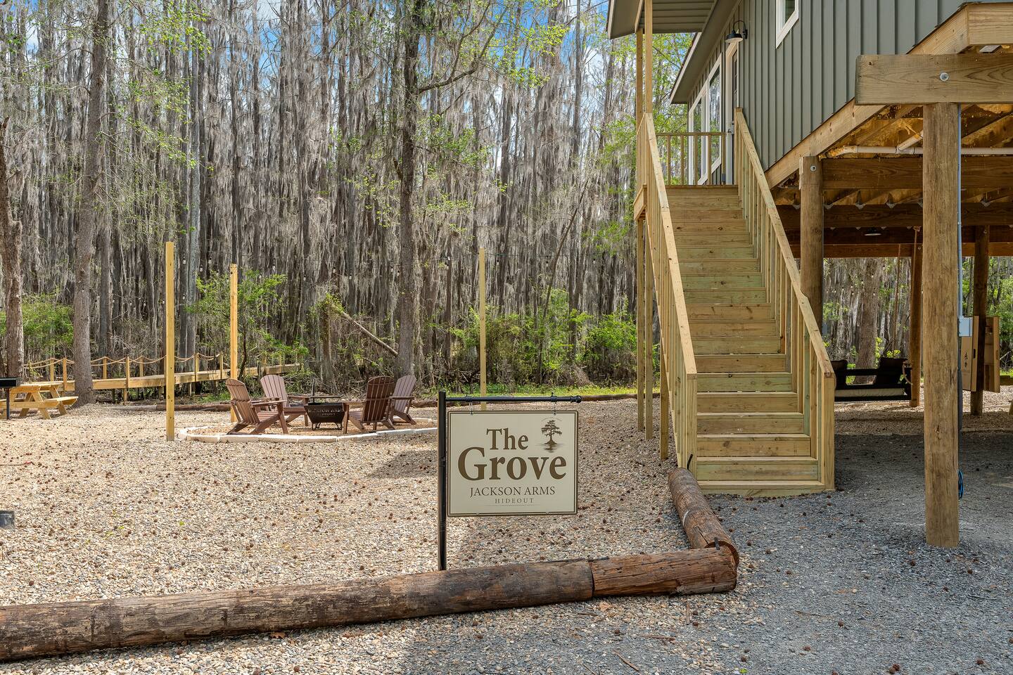 The Grove @ Jackson Arms Hideout on Caddo Lake You didn't stumble across this listing by accident. Something in you is searching. Maybe it's been a long week. Maybe it's been a long year. Maybe the tabs open in your brain have multiplied to the point where you can't remember what you were actually supposed to be doing. Or maybe you know exactly what you're looking for — a little stillness, a little space, and the right person to share it with. Either way, you landed here for a reason. Here's what we know: you need this. Your journey begins the moment you click "Reserve." Something shifts. Suddenly the week ahead has a finish line. You're more focused, more present — science actually backs that up. The anticipation alone starts the healing before you ever pack a bag. Then comes the drive in. Each turn feels like more nowhere than the nowhere before it. A curve opens to a small hill, an ancient cross tie bridge over a canal just off the Big Cypress Bayou. Thump. Thump. Thump. You slow down — not just the car. Pine trees, oak trees, cypress draped in Spanish moss arching overhead like a cathedral. Something in your chest loosens. You didn't even realize how tight it was. By the time you see the first Jackson Arms Hideout sign, the outside world has already started to feel like a faint memory. That's Caddo doing what Caddo does. A few back roads later, you arrive at The Grove @ Jackson Arms Hideout. Elevated 15 feet above the earth on piers, it rises into the treetops like it was always meant to be here. Step inside and the outside follows you. Floor to ceiling windows frame the cypress and moss like a living painting that changes by the hour. Vaulted ceilings, warm wood floors, and rich, deep tones that wrap around you like an exhale you didn't know you were holding. The kind of space that makes you set your phone face down without anyone asking you to. The bathroom delivers its own reward — a bold walk-in shower and a freestanding soaking tub beside it that was clearly designed with long evenings and zero agenda in mind. When you're ready to venture out, head downstairs where the real fun lives. Cornhole, a fire pit, a propane grill, a charcoal grill, picnic tables, and kayaks ready to hit the water. And then there's the dock. Six hundred feet of it stretching out over Caddo with your own private 12x12 space at the end. Walk it slowly. Fish off the end. Watch the sun drop behind the cypress and stay until the stars take over. You'll understand why people come back to Jackson Arms Hideout year after year. That's where we leave you. This is your time. Your moment. Your story to write — alone or with someone worth writing it with. Jackson Arms Hideout exists for exactly this. A place people find by searching and return to by choice. Close the tabs. Put down the phone. Transform back into the curious, unhurried version of yourself you've been meaning to find again. The Grove @ Jackson Arms Hideout is ready when you are. *A Few Important Notes* -The Grove is one of five cabins at Jackson Arms Hideout. Traveling with a group? Book multiple. The Haven: www.airbnb.com/h/jahhaven The Retreat: www.airbnb.com/h/jahretreat The Perch: www.airbnb.com/h/jahperch The Refuge: www.airbnb.com/h/jahrefuge -Caddo water levels rise and fall due to several factors. Rain and Lake O' The Pines water levels are two of those reasons. There may be instances throughout the year when cabins could be unreachable. If there is even a chance of this during your stay, we will let you know as soon as we know. Feel free to reach out prior to booking with any questions. -Bugs. They live here. It's the woods. -Boats. Water level at the dock fluctuates from no water to 5 feet. There is a boat ramp less than a 5 minute drive from the property. -Please be mindful of children or elderly guests. There are stairs & other tripping hazards and the property is adjacent to a body of water. -There is some poison ivy if you venture outside the landscaped areas. -Wildlife galore including the ones that slither. Watch where you walk. -NO Pets unless you plan to leave them outside