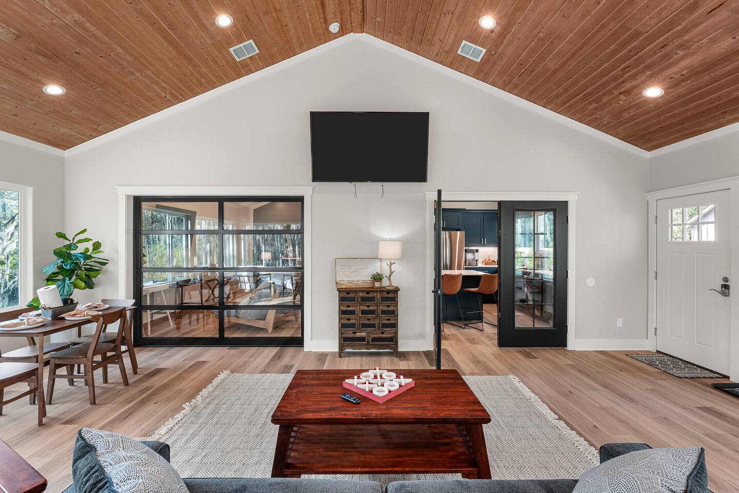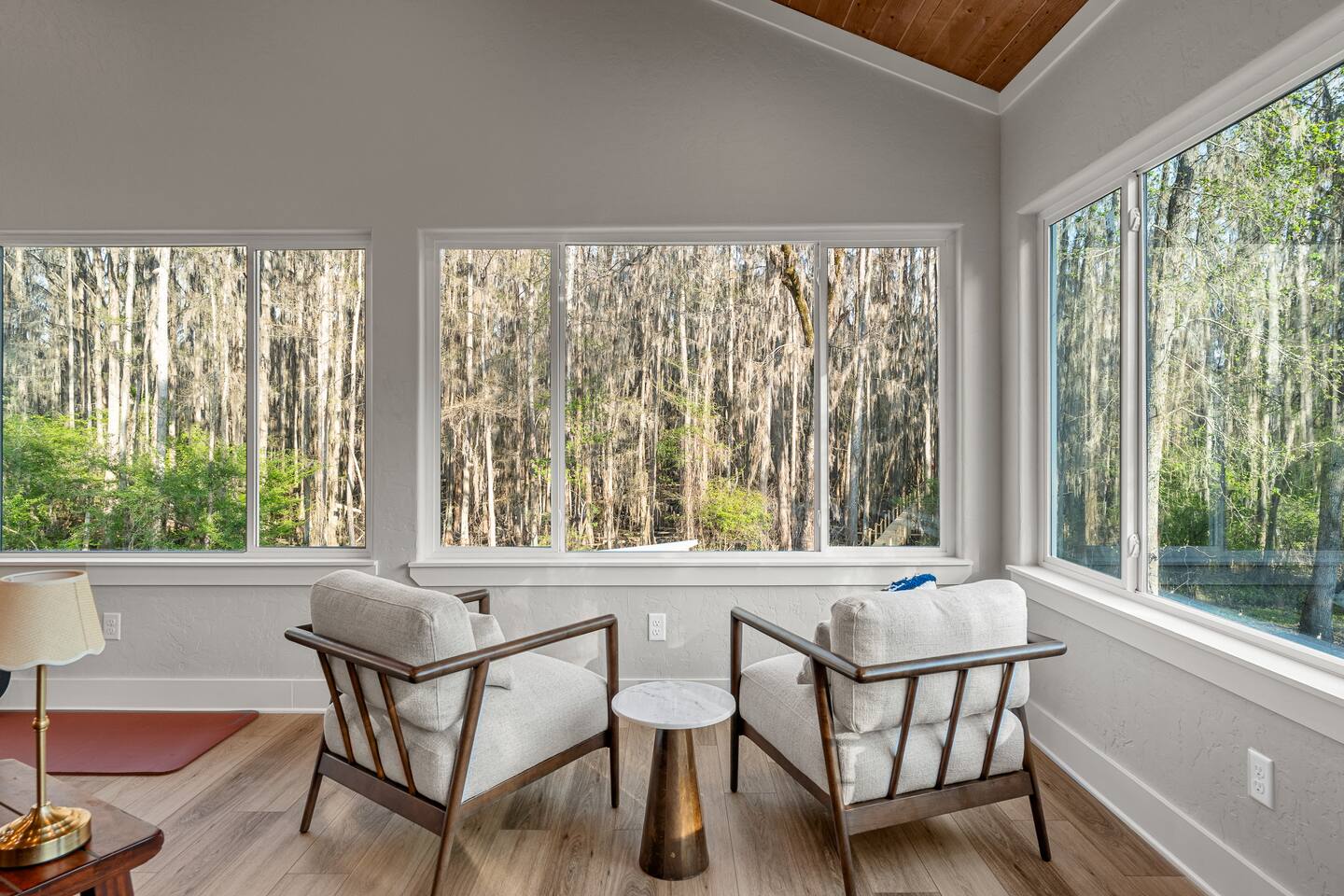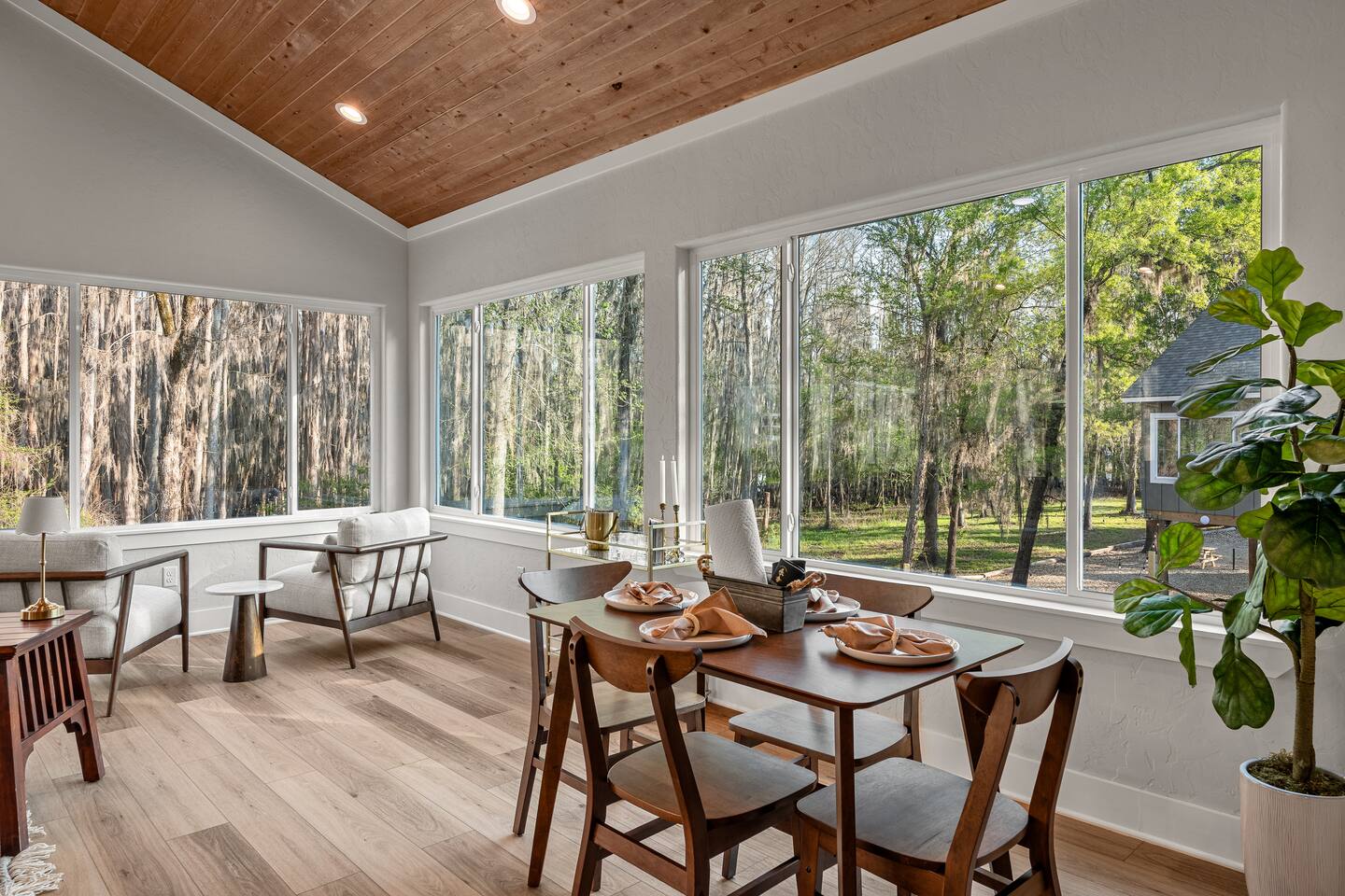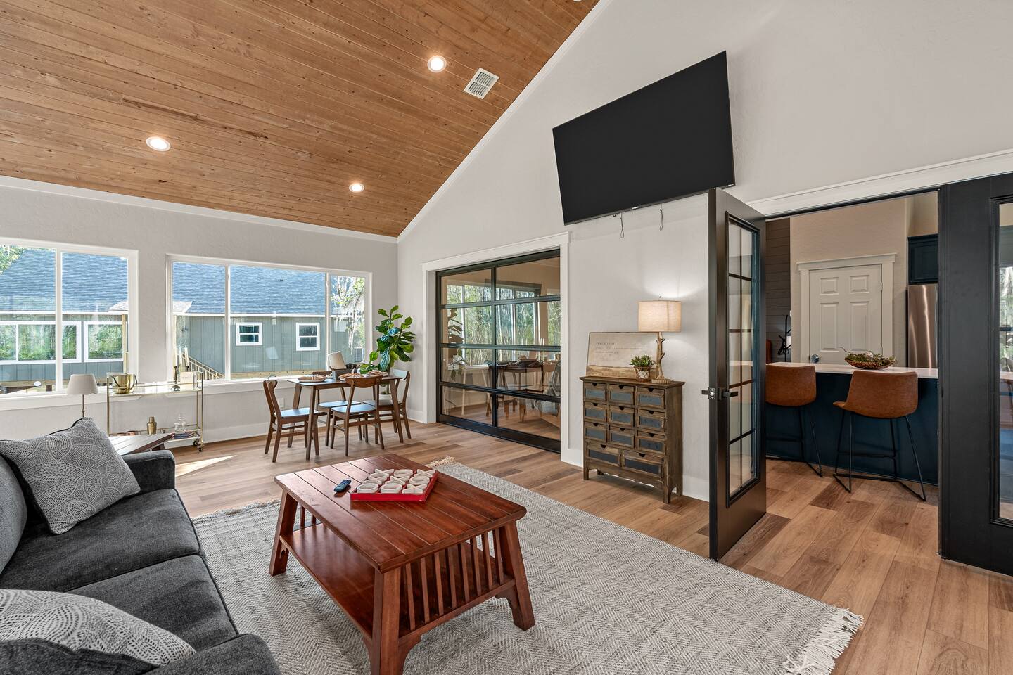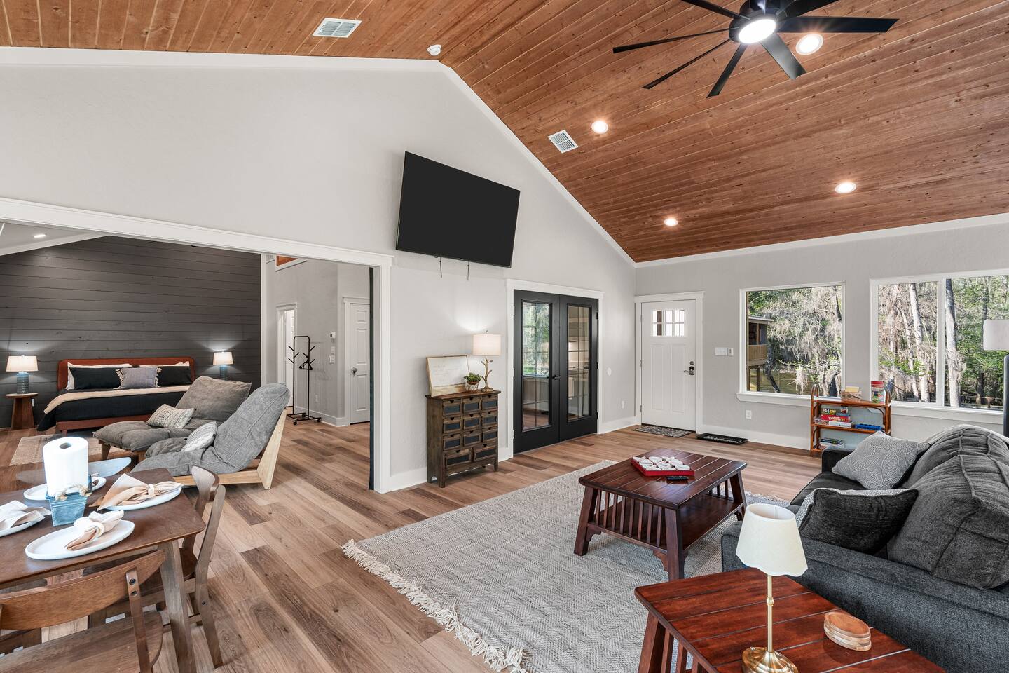 Lifted above the cypress-lined shores of legendary Caddo, The Refuge @ Jackson Arms Hideout rises on piers into the treetops where the light is softer and the air is easier to breathe. Inside, vaulted ceilings soar overhead while walls of windows pour sunlight across warm wood floors and frame living views of Spanish moss and still water. Kayak, fish, soak, or simply sit in the quiet and remember what it feels like to have nowhere to be.