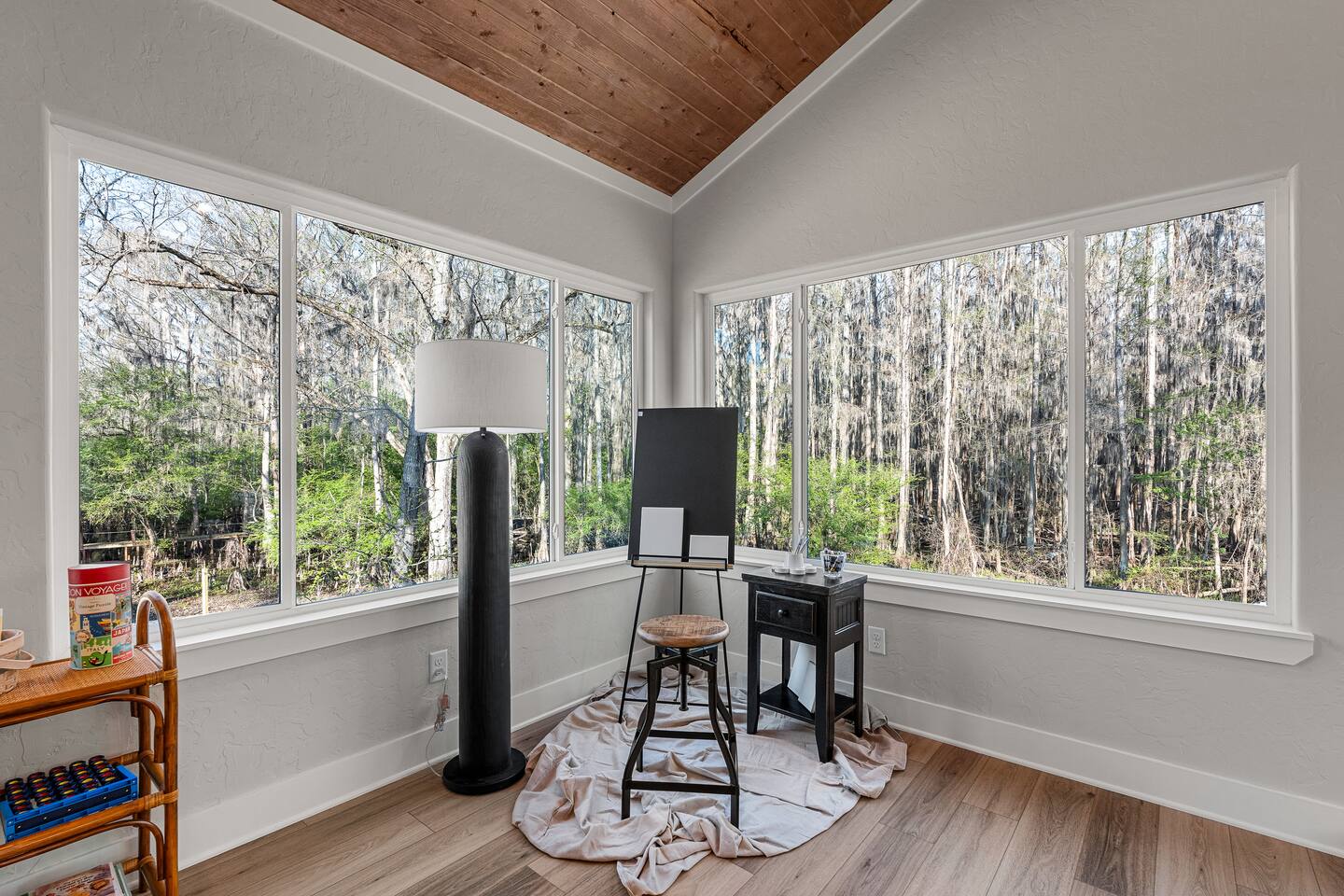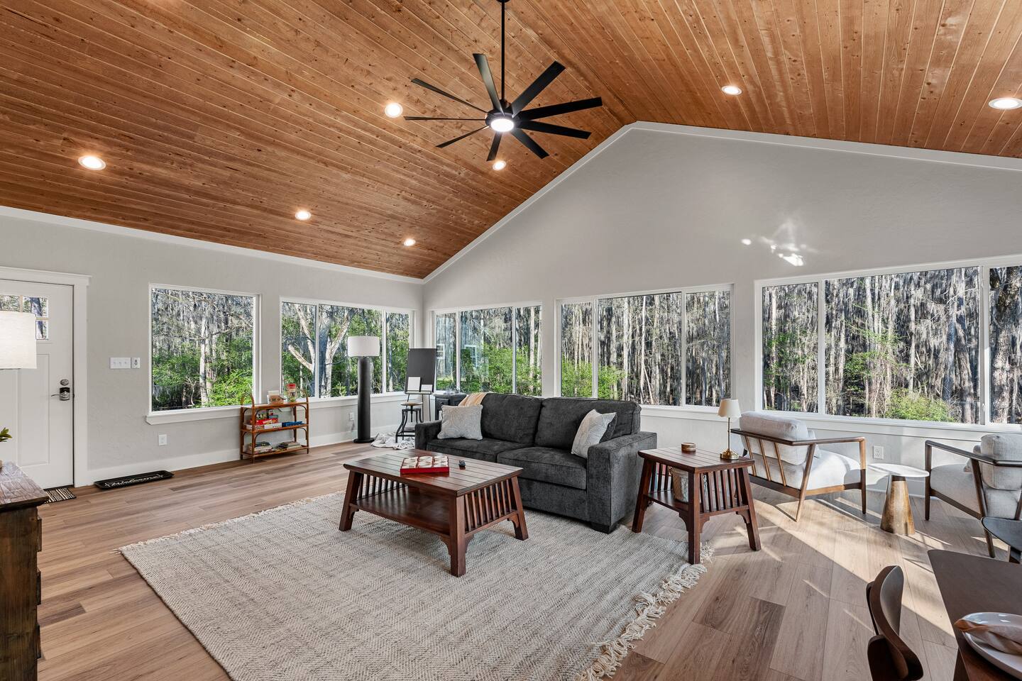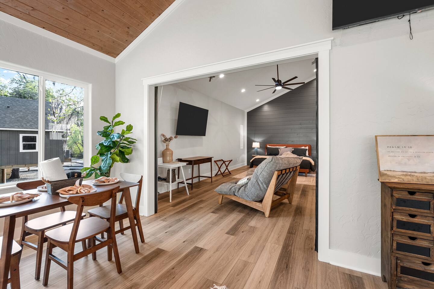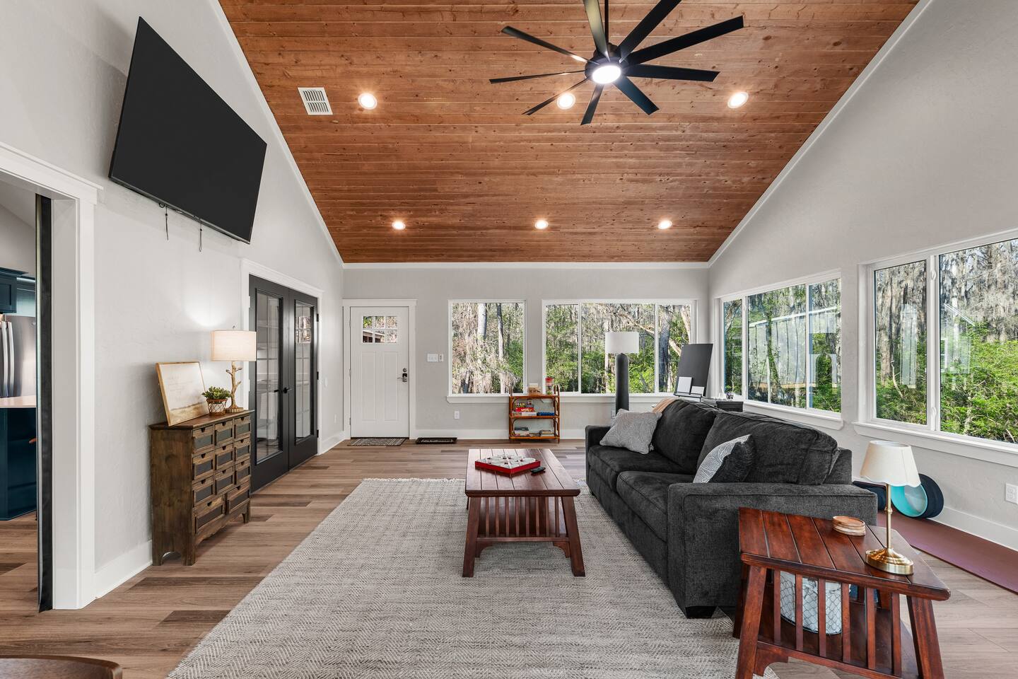 Lifted above the cypress-lined shores of legendary Caddo, The Refuge @ Jackson Arms Hideout rises on piers into the treetops where the light is softer and the air is easier to breathe. Inside, vaulted ceilings soar overhead while walls of windows pour sunlight across warm wood floors and frame living views of Spanish moss and still water. Kayak, fish, soak, or simply sit in the quiet and remember what it feels like to have nowhere to be.
