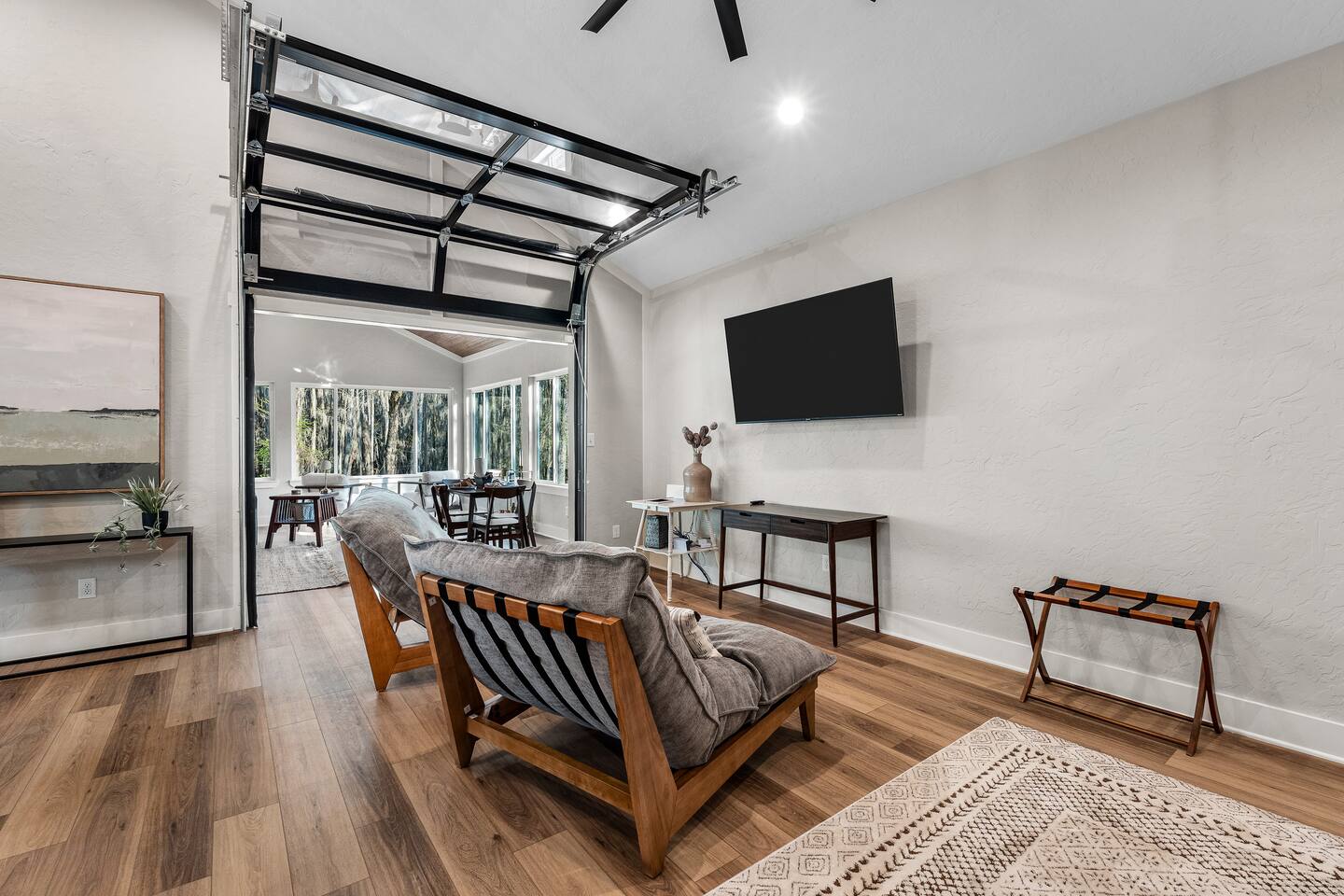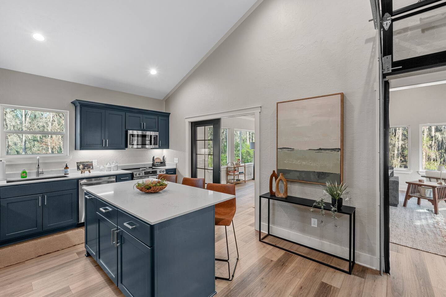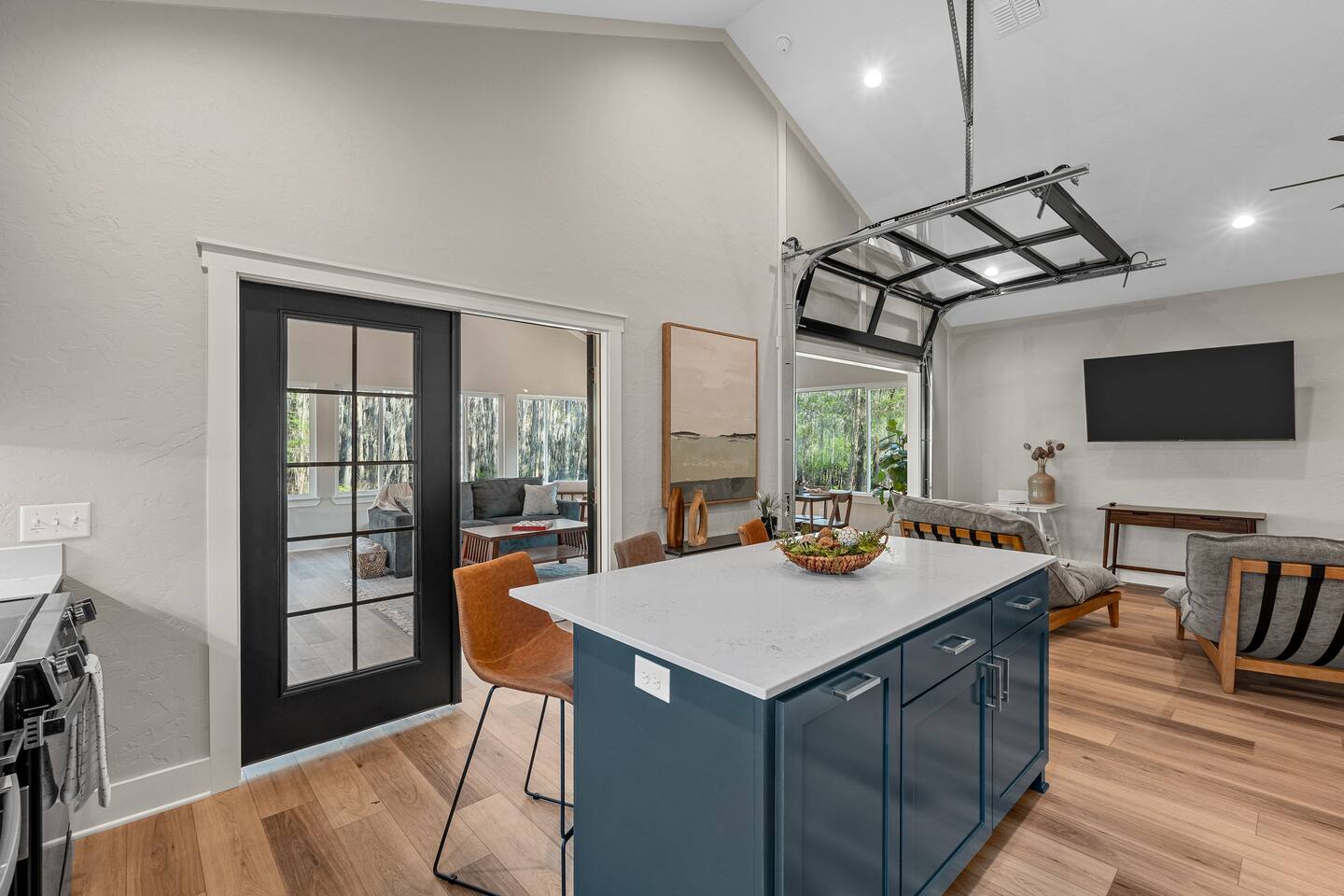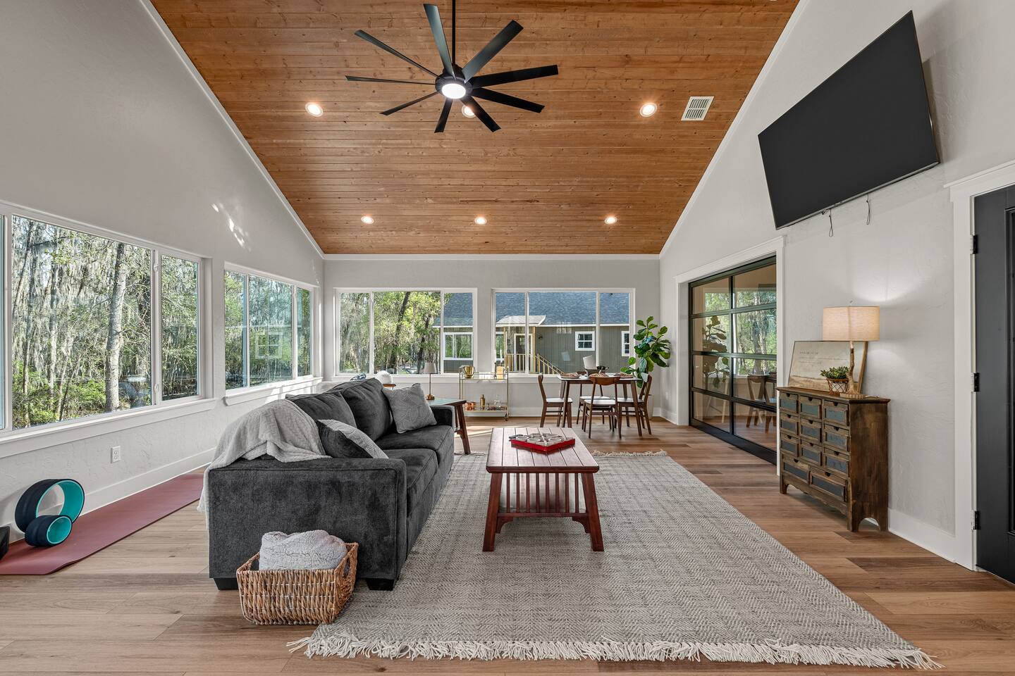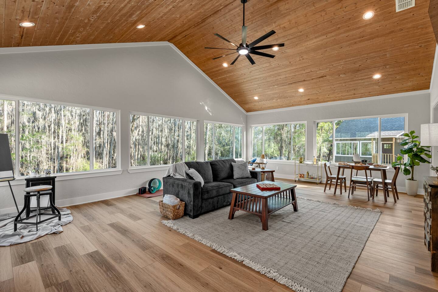 Lifted above the cypress-lined shores of legendary Caddo, The Refuge @ Jackson Arms Hideout rises on piers into the treetops where the light is softer and the air is easier to breathe. Inside, vaulted ceilings soar overhead while walls of windows pour sunlight across warm wood floors and frame living views of Spanish moss and still water. Kayak, fish, soak, or simply sit in the quiet and remember what it feels like to have nowhere to be.