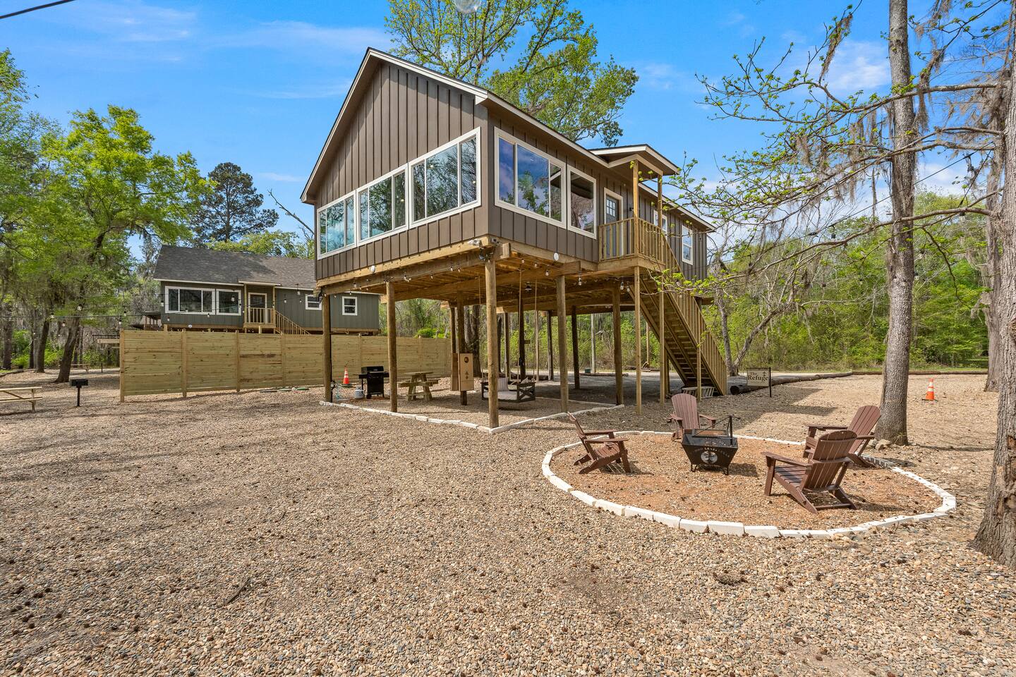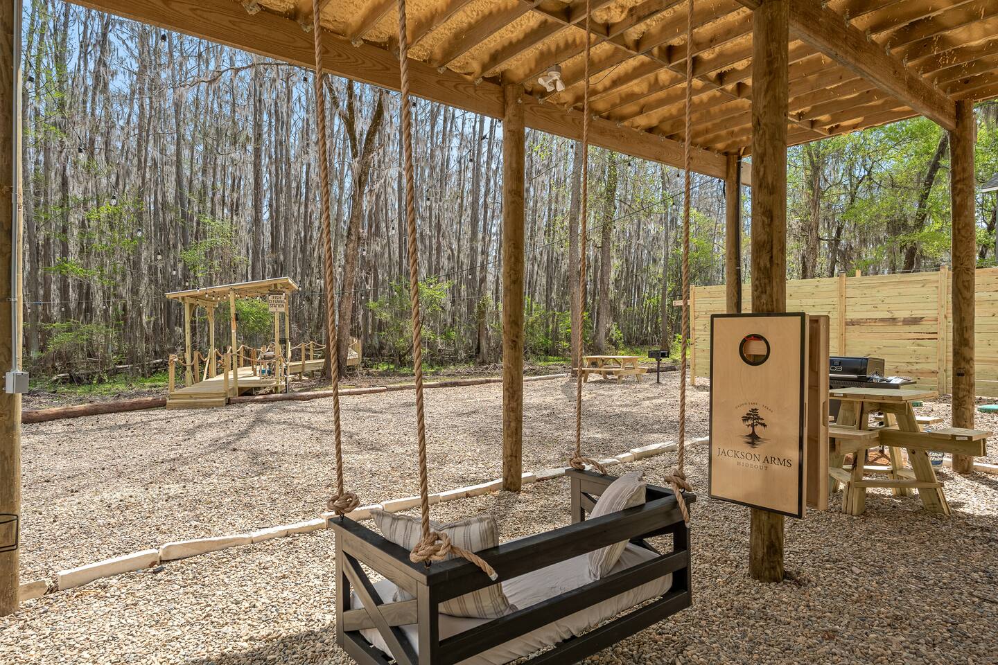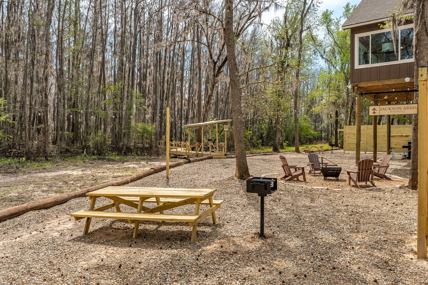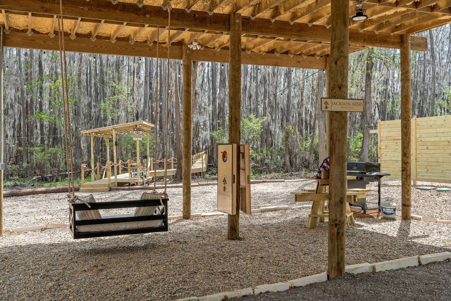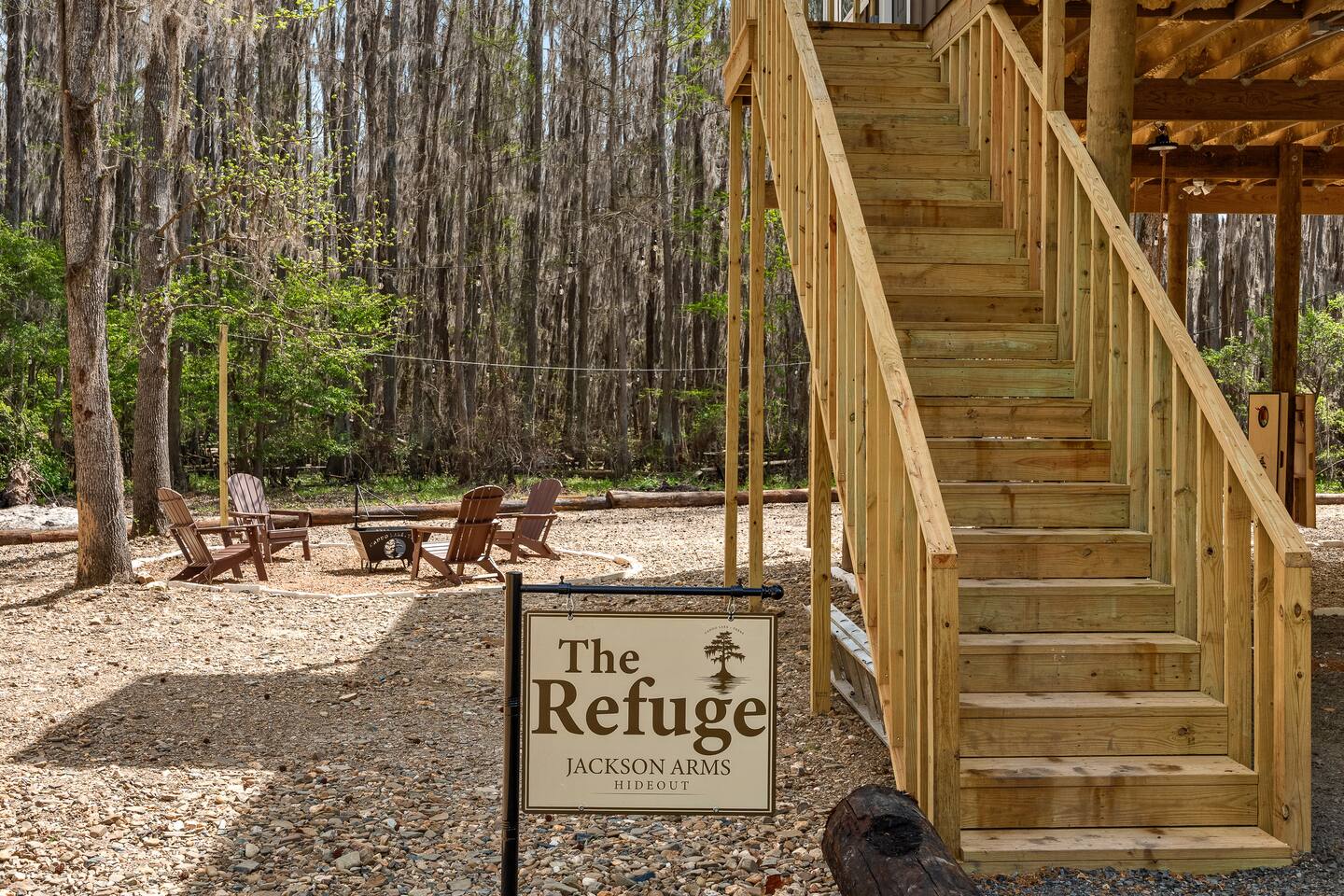 The Refuge @ Jackson Arms Hideout on Caddo Lake You felt it before you could name it. That low hum of too much. Too many notifications. Too many obligations. Too many people needing too many things from you all at once. You're burned out. You're overdue. This is your sign. The moment you hit "Reserve" something quietly changes. Your brain, smart as it is, starts clearing a path. Deadlines sharpen. The noise starts organizing itself around a date on the calendar that belongs entirely to you. That's not a coincidence. That's your mind making room for what's coming. What's coming is Jackson Arms Hideout on Caddo. The drive in does something to people. It's hard to explain until you've felt it. The roads narrow. The trees multiply. The spanish moss hangs heavy and still over a winding path that feels less like a drive and more like a slow exhale. An ancient cross tie bridge over a canal just off the Big Cypress Bayou announces your arrival with a familiar thump thump thump beneath your tires. First timers always slow down without meaning to. The windows come down on their own. And somewhere between the moss and the stillness, the breeze finds its way in and becomes the first deep breath you've taken in weeks. By the time you see the first Jackson Arms Hideout sign, the outside world has already started to feel like a faint memory. That's Caddo doing what Caddo does. A few back roads later you arrive at The Refuge @ Jackson Arms Hideout. Lifted 15 feet above the ground on piers, it rises above the treeline with an easy, unhurried confidence. Step through the door and the outside world doesn't just disappear — it transforms into something you actually want to look at. An entire wall of windows frames a straight line view of the dock and cypress trees draped in spanish moss that will stop you mid-sentence. During the day it's breathtaking. At night, with the string lights glowing down the dock and reflecting off the still water, it's something else entirely. You'll find yourself standing there, not saying anything because words would only get in the way. You'll reach for their hand. They'll lean in. And in that moment, all the noise, all the rushing, all the things that pulled you apart. It all just disappears. There's only this. Only them. Only now. That's the moment The Refuge @ Jackson Arms Hideout was built for. That's why you came. This cabin was built for two. For the kind of connection that gets buried under busy schedules and good intentions. Warm wood floors, vaulted ceilings, a dining table set for an evening worth lingering over, a bar cart for the nights that call for something slow and intentional, and mid century chairs positioned perfectly in front of those windows like they've been waiting for you both to sit down and remember why you chose each other. The bathroom delivers its own moment — a tiled walk-in shower and a freestanding soaking tub beside it that practically begs you to light a candle and stay a while. And for those bringing a little one along or traveling as two couples looking to share a space, there is a separated porch style room with a pull out sofa. When the walls start feeling too good to leave, head downstairs anyway. Cornhole, a fire pit, a propane grill, a charcoal grill, picnic tables, and kayaks waiting at the water's edge. And then there's the dock. Six hundred feet of it stretching straight out over Caddo with your own private 12x12 space at the end like an invitation written just for you. Walk it together. Fish off the end. Sit in the quiet and let God's creation do what it does out here — remind you what actually matters. That's where we leave you. Sleep in. Cook together. Sit on the dock until the stars come out and the string lights blur at the edges. Stare at a fire until the conversations go deeper than they have in months. Jackson Arms Hideout has a way of stripping everything back down to what's real. Come find out what's waiting when the noise finally stops. The Refuge is ready. The question is: Are you ready for a refuge? *A Few Important Notes* - The Refuge is one of five cabins at Jackson Arms Hideout. Traveling with a group? Book multiple. The Grove: www.airbnb.com/h/jahgrove The Haven: www.airbnb.com/h/jahhaven The Retreat: www.airbnb.com/h/jahretreat The Perch: www.airbnb.com/h/jahperch - Caddo water levels rise and fall due to several factors. Rain and Lake O' The Pines water levels are two of those reasons. There may be instances throughout the year when cabins could be unreachable. If there is even a chance of this during your stay, we will let you know as soon as we know. Feel free to reach out prior to booking with any questions. - Bugs. They live here. It's the woods. - Boats. Water level at the dock fluctuates from no water to 5 feet. There is a boat ramp less than a 5 minute drive from the property. - Please be mindful of children or elderly guests. There are tripping hazards and stairs and the property is adjacent to a body of water. - There is some poison ivy if you venture outside the landscaped areas. - Wildlife galore including the ones that slither. Watch where you walk.