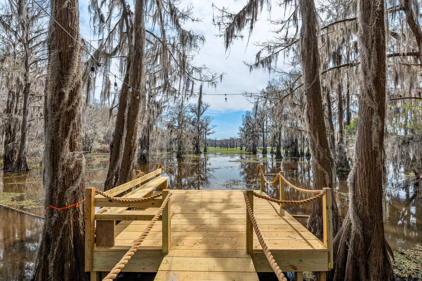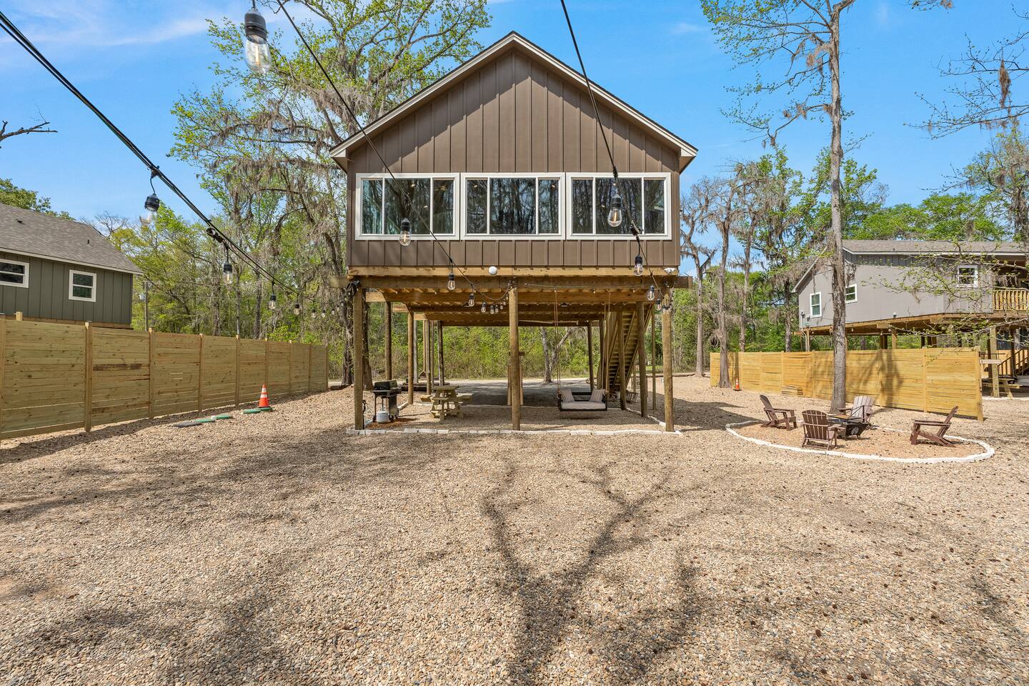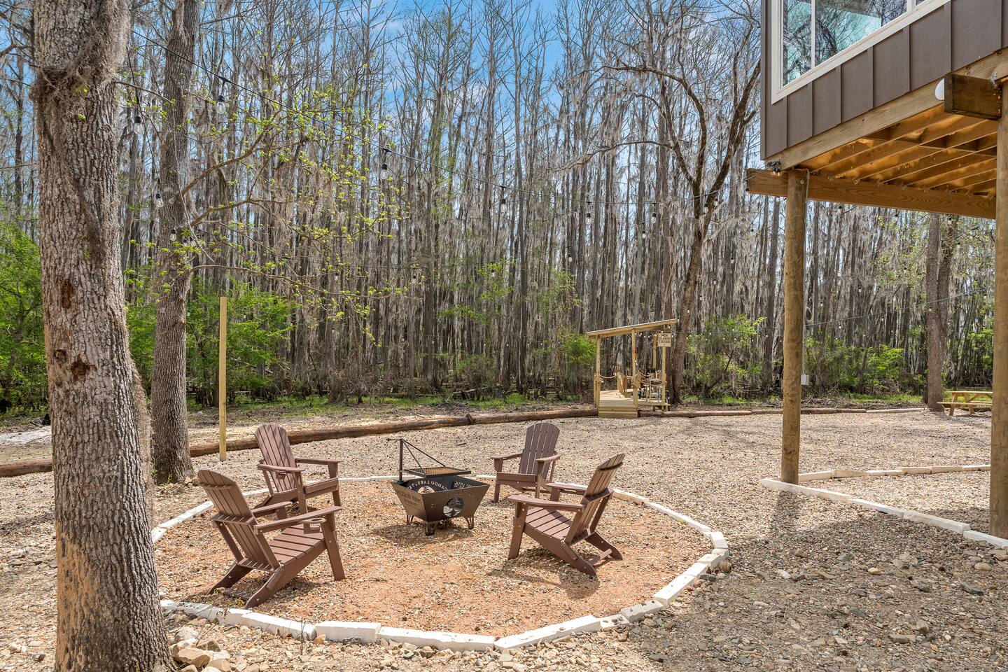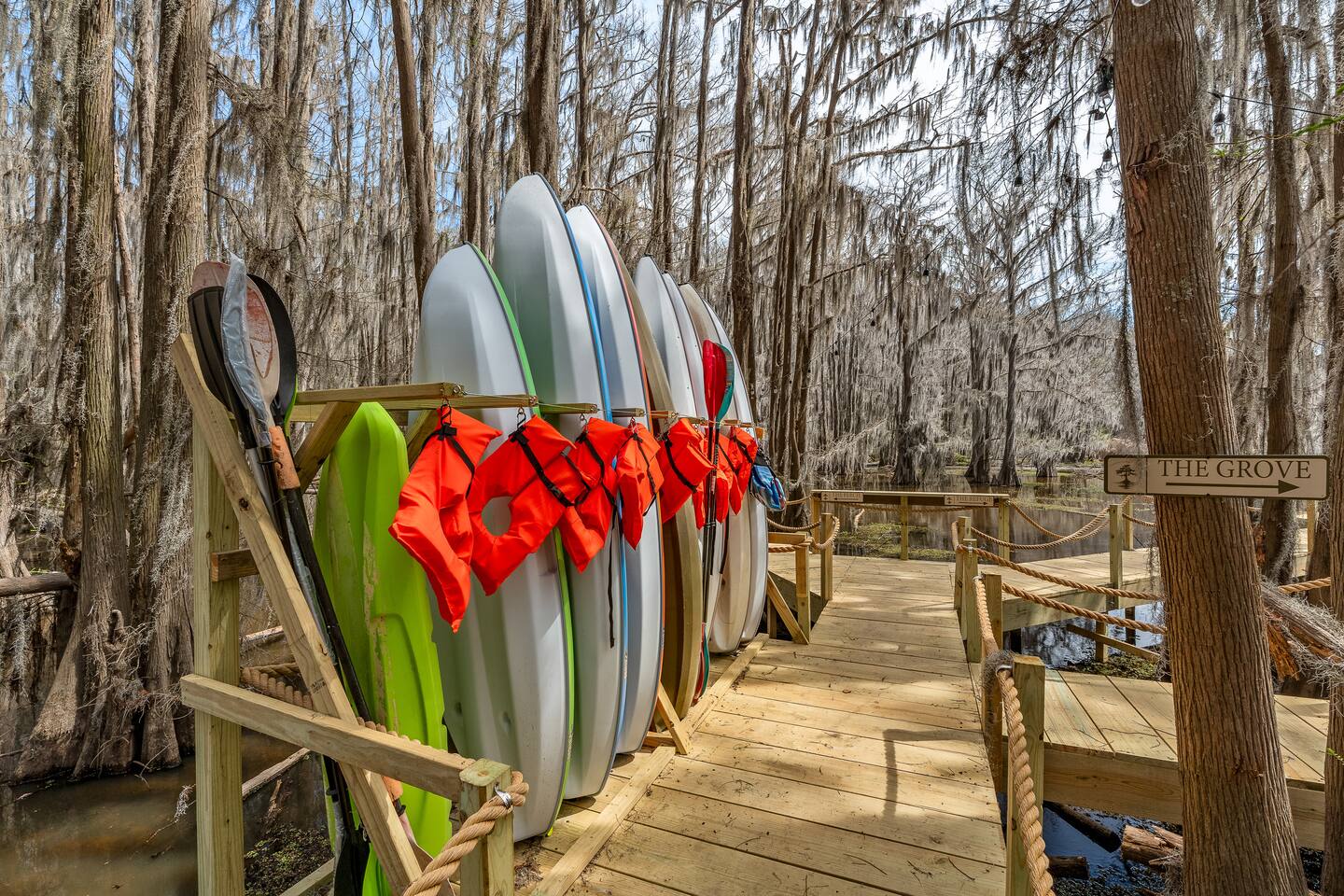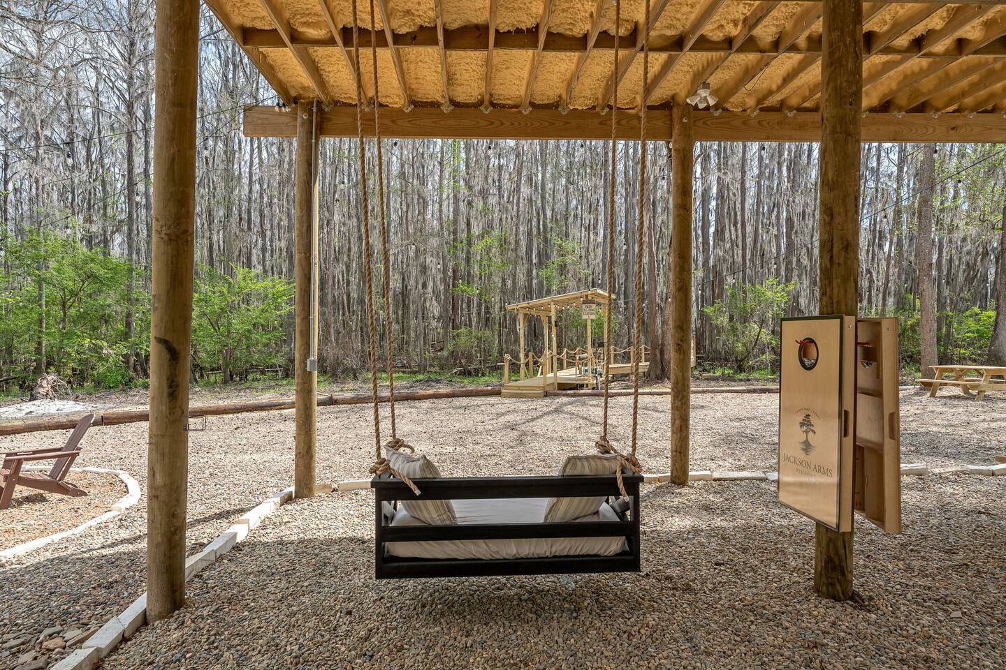 The Refuge @ Jackson Arms Hideout on Caddo Lake You felt it before you could name it. That low hum of too much. Too many notifications. Too many obligations. Too many people needing too many things from you all at once. You're burned out. You're overdue. This is your sign. The moment you hit "Reserve" something quietly changes. Your brain, smart as it is, starts clearing a path. Deadlines sharpen. The noise starts organizing itself around a date on the calendar that belongs entirely to you. That's not a coincidence. That's your mind making room for what's coming. What's coming is Jackson Arms Hideout on Caddo. The drive in does something to people. It's hard to explain until you've felt it. The roads narrow. The trees multiply. The spanish moss hangs heavy and still over a winding path that feels less like a drive and more like a slow exhale. An ancient cross tie bridge over a canal just off the Big Cypress Bayou announces your arrival with a familiar thump thump thump beneath your tires. First timers always slow down without meaning to. The windows come down on their own. And somewhere between the moss and the stillness, the breeze finds its way in and becomes the first deep breath you've taken in weeks. By the time you see the first Jackson Arms Hideout sign, the outside world has already started to feel like a faint memory. That's Caddo doing what Caddo does. A few back roads later you arrive at The Refuge @ Jackson Arms Hideout. Lifted 15 feet above the ground on piers, it rises above the treeline with an easy, unhurried confidence. Step through the door and the outside world doesn't just disappear — it transforms into something you actually want to look at. An entire wall of windows frames a straight line view of the dock and cypress trees draped in spanish moss that will stop you mid-sentence. During the day it's breathtaking. At night, with the string lights glowing down the dock and reflecting off the still water, it's something else entirely. You'll find yourself standing there, not saying anything because words would only get in the way. You'll reach for their hand. They'll lean in. And in that moment, all the noise, all the rushing, all the things that pulled you apart. It all just disappears. There's only this. Only them. Only now. That's the moment The Refuge @ Jackson Arms Hideout was built for. That's why you came. This cabin was built for two. For the kind of connection that gets buried under busy schedules and good intentions. Warm wood floors, vaulted ceilings, a dining table set for an evening worth lingering over, a bar cart for the nights that call for something slow and intentional, and mid century chairs positioned perfectly in front of those windows like they've been waiting for you both to sit down and remember why you chose each other. The bathroom delivers its own moment — a tiled walk-in shower and a freestanding soaking tub beside it that practically begs you to light a candle and stay a while. And for those bringing a little one along or traveling as two couples looking to share a space, there is a separated porch style room with a pull out sofa. When the walls start feeling too good to leave, head downstairs anyway. Cornhole, a fire pit, a propane grill, a charcoal grill, picnic tables, and kayaks waiting at the water's edge. And then there's the dock. Six hundred feet of it stretching straight out over Caddo with your own private 12x12 space at the end like an invitation written just for you. Walk it together. Fish off the end. Sit in the quiet and let God's creation do what it does out here — remind you what actually matters. That's where we leave you. Sleep in. Cook together. Sit on the dock until the stars come out and the string lights blur at the edges. Stare at a fire until the conversations go deeper than they have in months. Jackson Arms Hideout has a way of stripping everything back down to what's real. Come find out what's waiting when the noise finally stops. The Refuge is ready. The question is: Are you ready for a refuge? *A Few Important Notes* - The Refuge is one of five cabins at Jackson Arms Hideout. Traveling with a group? Book multiple. The Grove: www.airbnb.com/h/jahgrove The Haven: www.airbnb.com/h/jahhaven The Retreat: www.airbnb.com/h/jahretreat The Perch: www.airbnb.com/h/jahperch - Caddo water levels rise and fall due to several factors. Rain and Lake O' The Pines water levels are two of those reasons. There may be instances throughout the year when cabins could be unreachable. If there is even a chance of this during your stay, we will let you know as soon as we know. Feel free to reach out prior to booking with any questions. - Bugs. They live here. It's the woods. - Boats. Water level at the dock fluctuates from no water to 5 feet. There is a boat ramp less than a 5 minute drive from the property. - Please be mindful of children or elderly guests. There are tripping hazards and stairs and the property is adjacent to a body of water. - There is some poison ivy if you venture outside the landscaped areas. - Wildlife galore including the ones that slither. Watch where you walk.